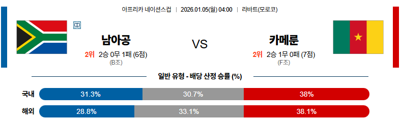 심리적으로도 남아공은 승점 1만으로도 어느 정도 만족해야 하는 입장에 있는 반면, 카메룬은 이 매치를 반드시 승리해야 한다는 동기부여가 뚜렷합니다. 따라서 경기 후반부로 갈수록 리스크를 감수하고라도 밀어붙일 팀은 카메룬 쪽이며, 이는 자연스럽게 슈팅 볼륨과 위협 지수의 차이로 이어질 수 있습니다. 전술 구조, 공격 루트의 다양성, 에이스 한 명이 경기 전체의 흐름을 바꿀 수 있는 영향력까지 모두 고려할 때, 이 매치는 카메룬 쪽으로 기울어진 대진이라고 보는 것이 합리적입니다.