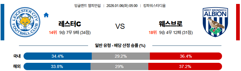 01월06일 레스터시티:웨스트브로미치 잉글랜드챔피언쉽 분석 및 예측 스포츠중계:스포츠무료중계