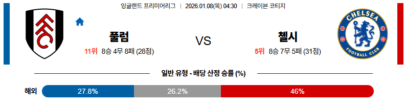 01월08일 풀럼:첼시 프리미어리그 분석 및 예측 스포츠중계:스포츠무료중계