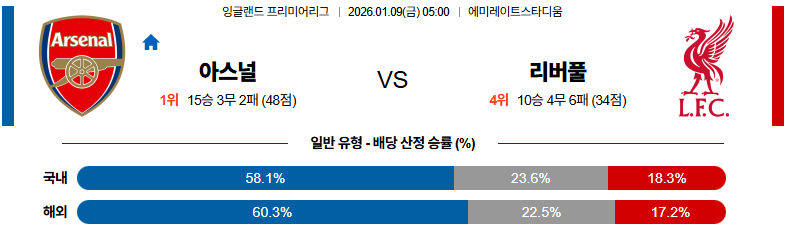 01월09일 아스널:리버풀 프리미어리그 분석 및 예측 스포츠중계:스포츠무료중계
