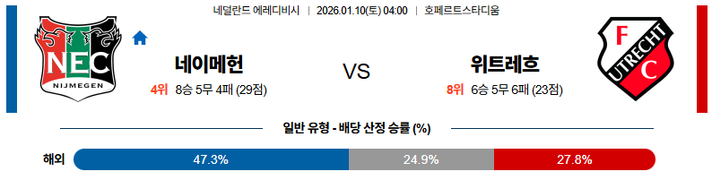 01월10일 네이메헌:위트레흐트 에레디비지 분석 및 예측 스포츠중계:스포츠무료중계