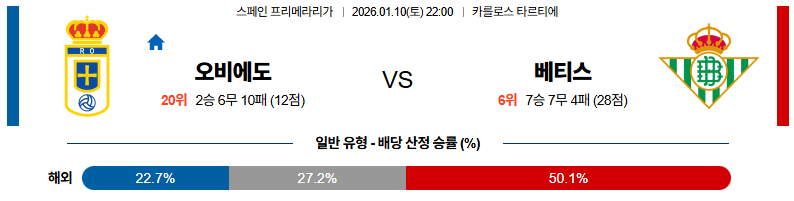01월10일 오비에도:베티스 라리가 분석 및 예측 스포츠중계:스포츠무료중계