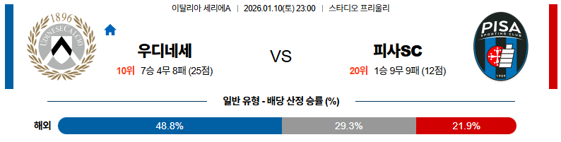 01월10일 우디네세:피사 세리에A 분석 및 예측 스포츠중계:스포츠무료중계