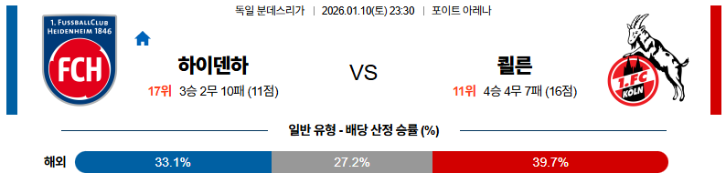 01월10일 하이덴하임:쾰른 분데스리가 분석 및 예측 스포츠중계:스포츠무료중계