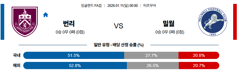 01월11일 번리:밀월 잉글랜드FA컵 분석 및 예측 스포츠중계:스포츠무료중계