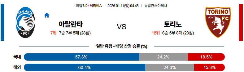 01월11일 아탈란타:토리노 세리에A 분석 및 예측 스포츠중계:스포츠무료중계