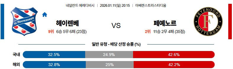 01월11일 헤이렌베인:페예노르트 에레디비지 분석 및 예측 스포츠중계:스포츠무료중계