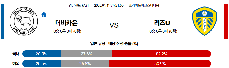 01월11일 더비카운티:리즈 잉글랜드FA컵 분석 및 예측 스포츠중계:스포츠무료중계