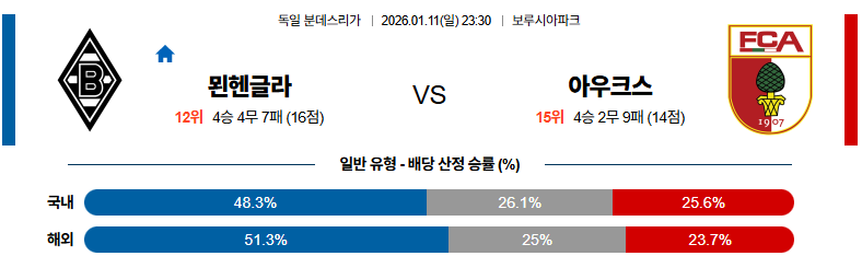 01월11일 묀헨글라트바흐:아우크스부르크 분데스리가 분석 및 예측 스포츠중계:스포츠무료중계