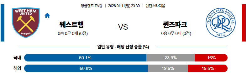 01월11일 웨스트햄:QPR 잉글랜드FA컵 분석 및 예측 스포츠중계:스포츠무료중계