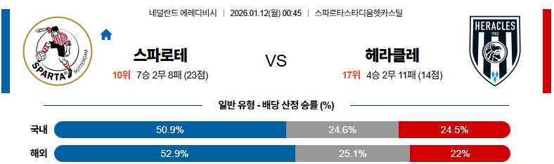 01월12일 스파르타:헤라클레스 에레디비지에 분석 및 예측 스포츠중계:스포츠무료중계