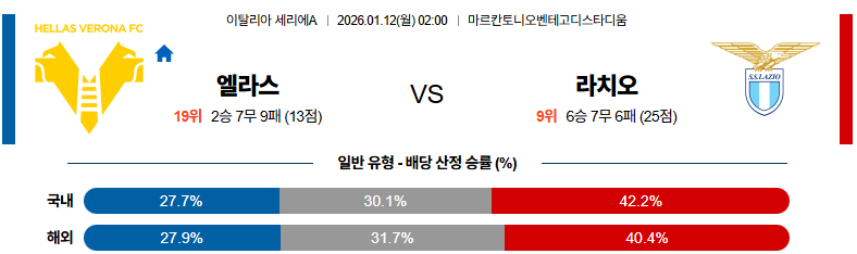 01월12일 엘라스베로나:라치오 세리에A 분석 및 예측 스포츠중계:스포츠무료중계