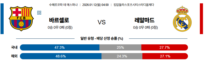 01월12일 바르셀로나:레알마드리드 수페르코파데에스파냐 분석 및 예측 스포츠중계:스포츠무료중계