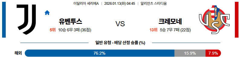01월13일 유벤투스:크레모네 세리에A 분석 및 예측 스포츠중계:스포츠무료중계