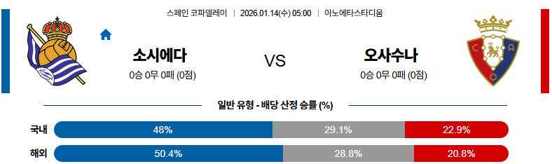 01월14일 소시에다드:오사수나 스페인코파델레이 분석 및 예측 스포츠중계:스포츠무료중계