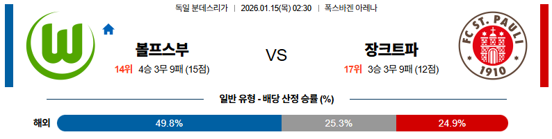 01월15일 장크트파울리:볼프스부르크 분데스리가 분석 및 예측 스포츠중계:스포츠무료중계