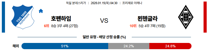 01월15일 호펜하임:묀헨글라트바흐 분데스리가 분석 및 예측 스포츠중계:스포츠무료중계