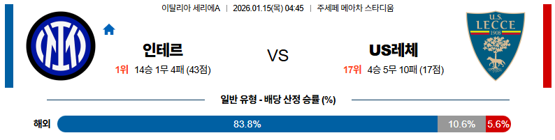 01월15일 인터밀란:레체 세리에A 분석 및 예측 스포츠중계:스포츠무료중계