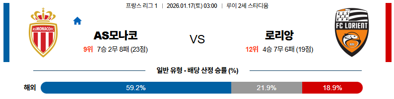 01월17일 AS모나코:로리앙 리그앙 분석 및 예측 스포츠중계:스포츠무료중계