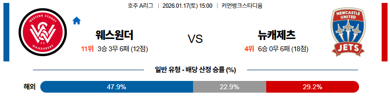 01월17일 웨스턴시드니:뉴캐슬제츠 호주A리그 분석 및 예측 스포츠중계:스포츠무료중계