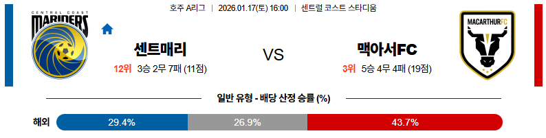 01월17일 센트럴코스트:맥아서FC 호주A리그 분석 및 예측 스포츠중계:스포츠무료중계
