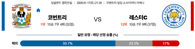 01월17일 코번트리:레스터시티 잉글랜드챔피언쉽 분석 및 예측 스포츠중계:스포츠무료중계
