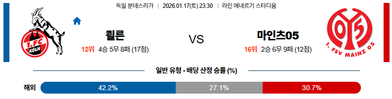 01월17일 쾰른:마인츠 분데스리가 분석 및 예측 스포츠중계:스포츠무료중계