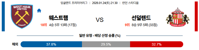 01월24일 웨스트햄:선덜랜드 프리미어리그 분석 및 예측 스포츠중계:스포츠무료중계