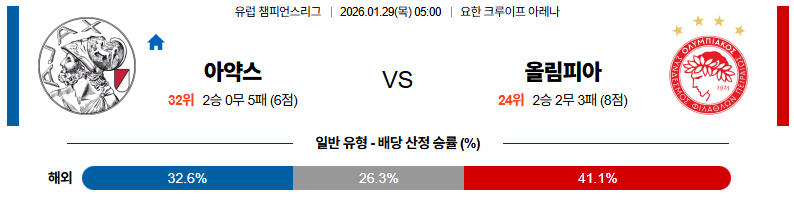 01월29일 아약스:올림피아코스 UEFA챔피언스리그 분석 및 예측 스포츠중계:스포츠무료중계