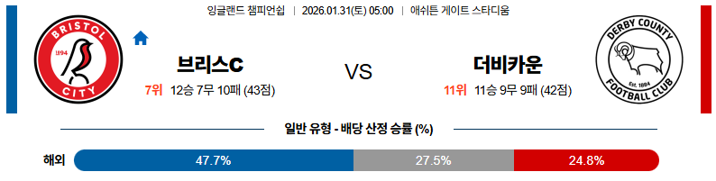 01월31일 브리스톨:더비카운티 잉글랜드챔피언쉽 분석 및 예측 스포츠중계:스포츠무료중계