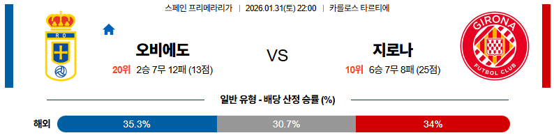 01월31일 오비에도:지로나 라리가 분석 및 예측 스포츠중계:스포츠무료중계