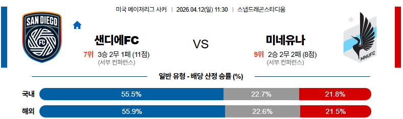 04월12일 샌디에고FC:미네소타 MLS 분석 및 예측 스포츠중계:스포츠무료중계