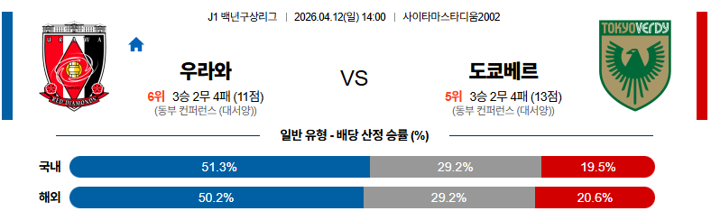 04월12일 우라와:도쿄베르디 J리그백년구상리그 분석 및 예측 스포츠중계:스포츠무료중계