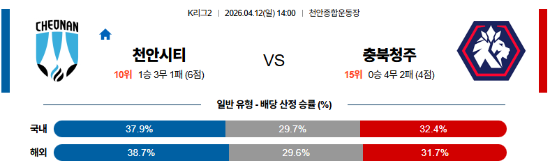 04월12일 천안:충북청주 K리그2 분석 및 예측 스포츠중계:스포츠무료중계