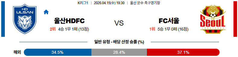 04월15일 울산HD:FC서울 K리그1 분석 및 예측 스포츠중계:스포츠무료중계