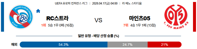 04월17일 스트라스부르 : 마인츠 UEFA유로파컨퍼런스 리그 분석 및 예측 스포츠중계,스포츠분석