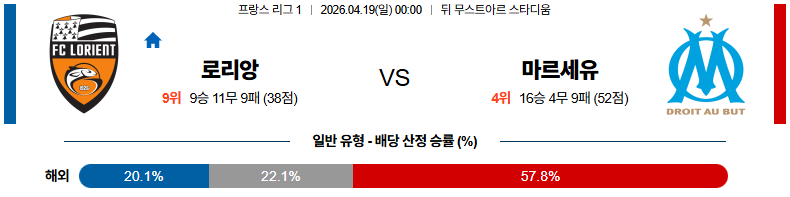 04월19일 로리앙 : 마르세유 리그앙 분석 및 예측 스포츠중계,스포츠분석