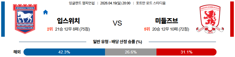 04월19일 입스위치 : 미들즈브러 잉글랜드챔피언쉽 리그 분석 및 예측 스포츠중계,스포츠분석