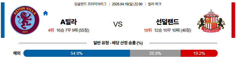 04월19일 아스톤빌라 : 선덜랜드 프리미어리그 분석 및 예측 스포츠중계,스포츠분석