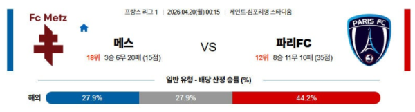 04월20일 메스 : 파리FC 리그앙 분석 및 예측 스포츠중계,스포츠분석
