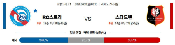 04월20일 스트라스부르 : 스타드렌 리그앙 분석 및 예측 스포츠중계,스포츠분석