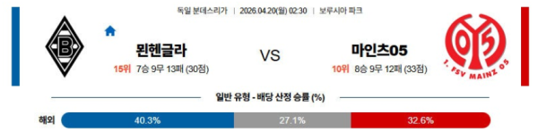 04월20일 묀헨글라트바흐 : 마인츠 분데스리가 분석 및 예측 스포츠중계,스포츠분석