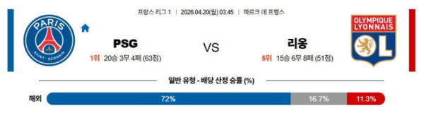 04월20일 파리생제르망 : 올림피크리옹 리그 분석 및 예측 스포츠중계,스포츠분석
