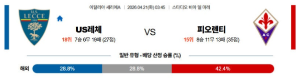 04월21일 US레체 : ACF피오렌티나 세리에A 분석 및 예측 스포츠중계,스포츠분석