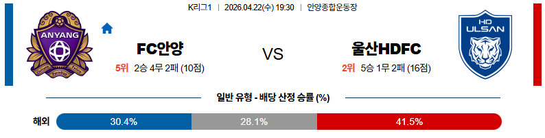 04월22일 안양 : 울산 K리그1 분석 및 예측 스포츠중계,스포츠분석
