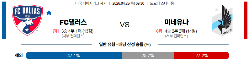 04월23일 댈러스:미네소타 MLS 분석 및 예측 스포츠중계:스포츠무료중계