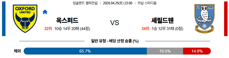 옥스퍼드는 상대가 가장 불안해하는 중원과 수비 사이 공간을 정면으로 찌를 수 있는 팀이며, 이번 상대 셰필드 웬즈데이는 바로 그 구간에서 흔들릴 가능성이 큽니다. 따라서 크라스테프의 전진 드리블, 프와헤타의 측면 전개, 랭크셔의 마무리 타이밍이 잘 맞아떨어진다면 경기의 흐름은 자연스럽게 옥스퍼드 쪽으로 기울 가능성이 높습니다. 셰필드 웬즈데이도 배넌의 전개로 한 방은 만들 수 있겠지만
