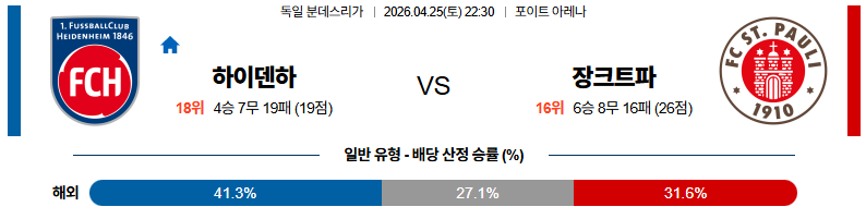 04월25일 장크트파울리:하이덴하임 분데스리가 분석 및 예측 스포츠중계:스포츠무료중계