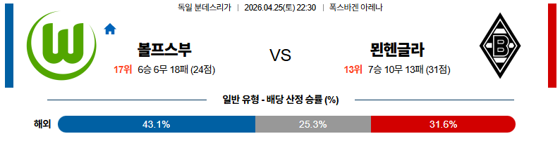 04월25일 묀헨글라트바흐:볼프스부르크 분데스리가 분석 및 예측 스포츠중계:스포츠무료중계