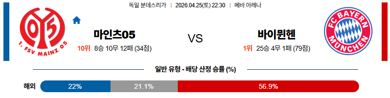 04월25일 마인츠:바이에른뮌헨 분데스리가 분석 및 예측 스포츠중계:스포츠무료중계